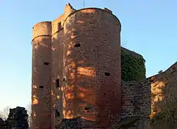 The dominant image of the castle is the two four-storey, roughly 24 metre-high, battery towers on the opposite side. They date to the first half of the 16th century. The west tower measures about 7 metres in height, the east tower, about 10 metres. The thickness of the walls is about 3 metres. Two embrasures (so-called Maulscharten) on the southern battery tower have been ornately carved into the shape of lions' faces.[2]