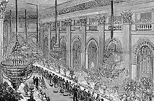 Alexander II was the last Tsar to use the Winter Palace extensively not only for governing the empire but also entertaining. Of special note were the Bals des Palmiers given at the palace. On these occasions, 100 palm trees were brought from the hot houses at Tsarskoe Selo; these would be scattered throughout the enfilade, and around them supper tables seating 15 people would be constructed. During the course of the evening the Tsar would make the rounds of the tables, eating a piece of bread or fruit at each, in order that the guests may say that they had dined with the Tsar.[5]