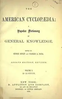 The New American Cyclopædia was revised and republished as the American Cyclopædia in 1873.[1]