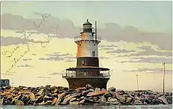 A peninsula, once known as "Little Necke" but since as Lighthouse Point after the light constructed on its tip in 1805, protects the harbor from the west. The original lighthouse was replaced in 1845 by the current Five Mile Point structure. It was replaced for navigation in 1877 by the offshore Southwest Ledge Light. Sperry Lighthouse (1899–1933) also served the harbor.