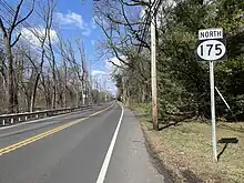 Route 175 is a short, 2.95-mile (4.75 km) long state highway in Mercer County, New Jersey, United States. The route runs along a former alignment of Route 29 before the construction of the John Fitch Parkway in the 1960s. The route begins at Route 29 in the capital city of Trenton, running along Sanhican Road, River Road, and West Upper Ferry Road into Ewing Township. The route serves primarily as a frontage road for Route 29. The northernmost portion of Route 175 is parallel to the Delaware and Raritan Canal until coming to an end at a merge with Route 29 in Ewing Township.