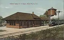 The Wallkill Valley Railroad, founded in 1866, stretched from Montgomery to Kingston. The New Paltz railroad station was originally built in 1870,[23] rebuilt after a 1907 fire.[24] The railroad and station later came under New York Central ownership. The NYC operated two trains a day, each direction, on a Kingston-New Paltz-Montgomery run. At Kingston, connections were available trains north to Albany and south to Weehawken, New Jersey.[25] The passenger service through New Paltz ended in 1937, and the rail division was abandoned by Conrail in 1983. The former roadbed was converted for use as the Wallkill Valley Rail Trail.[26]