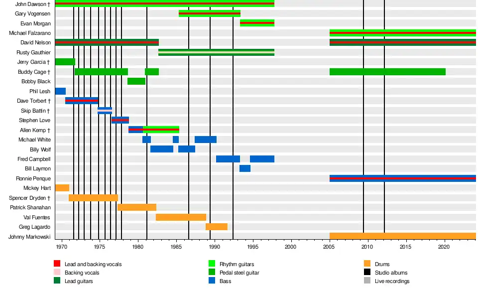 Past members | John Dawson Jerry Garcia Mickey Hart Bob Matthews Robert Hunter Phil Lesh Dave Torbert Spencer Dryden Buddy Cage Skip Battin Stephen A. Love Patrick Shanahan Allen Kemp Bobby Black Pete Grant Michael White Billy Wolf Val Fuentes Rusty Gauthier Greg Lagardo Gary Vogensen Fred Campbell Evan Morgan Bill Laymon |