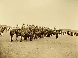 The volunteers came from Cootamundra, Gundagai, Wagga Wagga, Young, Hay, Cooma, Moree, Cobar, Tenterfield, and Bourke.[2] Formed as the sixth contingent of Imperial Bushman, with an original strength of 762 men under the command of Lieutenant Colonel Kenneth Mackay, the unit departed Sydney for South Africa on 23 April 1900 on the transport SS Armenian. Between May 1900 and May 1901 it served in Rhodesia as part of the Rhodesian Field Force under Lieutenant General Sir Frederick Carrington and later in West Transvaal, including the capture of Koos de la Rey's convoy and guns at Wildfontein on 24 March 1901. Lieutenant Colonel Haviland Le Mesurier took over as commanding officer in November 1900. The unit departed East London on the transport Orient and returned to Australia on 17 July 1901. Casualties included 13 killed or died of wounds and nine died of disease.[3] Members of the regiment received one Companion of The Most Honourable Order of the Bath, 4 Distinguished Service Orders and 1 Distinguished Conduct Medal.[1]