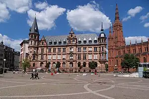 The New Town Hall (German: Neues Rathaus) is a town hall on the Schlossplatz in Wiesbaden, Hesse, Germany. It hosts the city government including the city council, offices of the mayors and part of the administration. It was built between 1884 and 1887 by Georg von Hauberrisser in a Renaissance Revival architecture style. The basement is almost completely occupied by a restaurant called Ratskeller.