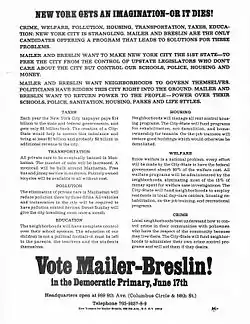 - ↑ Mailer-Breslin Campaign handbill (1969). (Image:Mailer-Breslin-Handbill-Back.jpg accompanies article.)