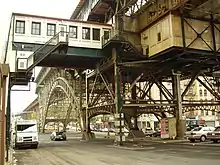 About 40% of the subway system runs on surface or elevated tracks, including steel or cast-iron elevated structures, concrete viaducts, embankments, open cuts and surface routes.[83] As of 2019, there are 168 miles (270 km) of elevated tracks.[84] All of these construction methods are completely grade-separated from road and pedestrian crossings, and most crossings of two subway tracks are grade-separated with flying junctions. The sole exceptions of at-grade junctions of two lines in regular service are the 142nd Street[85] and Myrtle Avenue junctions, whose tracks intersect at the same level, as well as the same-direction pairs of tracks on the IRT Eastern Parkway Line at Rogers Junction.[86][87]