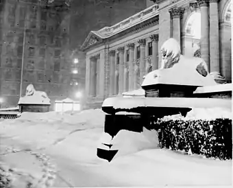 Patience and Fortitude, the "Library Lion" statues, in a December 1948 snowstorm