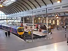 The main line serving the station is the East Coast Main Line from London to Edinburgh via Yorkshire and Newcastle. TransPennine Express maintains a frequent service to Liverpool and Manchester, and CrossCountry provides services to the West Midlands and South West of England. The station is also on the Durham Coast Line which provides commuter connections to Gateshead, Sunderland, Hartlepool, and Middlesbrough. Additionally, the station is served by the Tyne Valley Line to Hexham and Carlisle. Direct destinations from the station include London, Edinburgh, Aberdeen, Glasgow, Manchester, Liverpool, Leeds, Durham, Birmingham, York, Darlington, Bristol, Reading, and Plymouth.