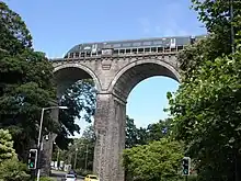 Between Newquay station and Tolcarn Junction the line crosses the Trenance valley on a 154-yard (141m) viaduct. The first structure, opened on 29 January 1849, was a timber structure on stone piers. It was much lighter than the similarly-constructed Cornwall Railway viaducts that were built a few years later, and very different from the imposing granite Treffry Viaduct built by Treffry for his Par tramway.