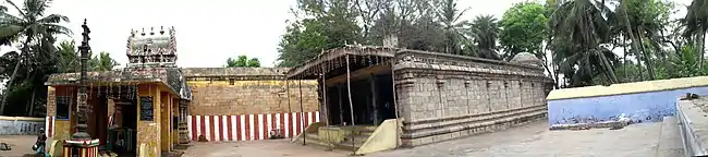 The temple has received contributions from various ruling kings from Pandyas, Pallava, Chola, Chera and from Irukkehvel family. The temple in its current form is believed to have been built during the 9th century by Chola king Aditya I based on various inscriptions in the temple. The earliest inscription in the temple is dated to AD 862 to the fourth year of Pandya king Marajadaiyan. Marajadaiyan is evidently Varaguna Pandiyan II who made extensive conquest of Chola territory. The two inscriptions in the two jambs on the temple indicating gift of 423 kasum to the presiding deity. The inscription in the opposite jamb indicates gift of 60 kalanjus of gold for lighting lamps in the temple by Pallava king Nandivarman III. An undated epigraph indicates hundred sheeps to the temple, possibly by Aditya I.A record of golden lamp to the temple during the 8th regnal year of Parantaka I. Some of the other inscriptions indicate gifts from Aditya's son Kannaradeva, Parantaka's son Arulkulakesari, the Chola queens Tennavan Mahadevi and Tavayur Kilaradigal. The inscriptions from Parantaka I indicates enquiries about the temple and Tiruvisakam festival during the Tamil month of Vaikasi. The inscriptions also indicate that they have to be placed in the southern side of the Ardhamandapa, leading to the conclusion that the structure was built during the reign of Aditya I.[3]