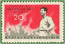 Trỗi was glorified by the Việt Cộng and North Vietnam as a martyr. The first notable act of recognition was in 1965 when the DRVN issued a postage stamp, illustrated on the right, bearing a portrait of him.[9] Considered an exemplar, Trỗi has his name bestowed upon a large school, the Lycée Nguyễn Văn Trỗi in Nha Trang, and a national academic award, The Nguyễn Văn Trỗi Prize.