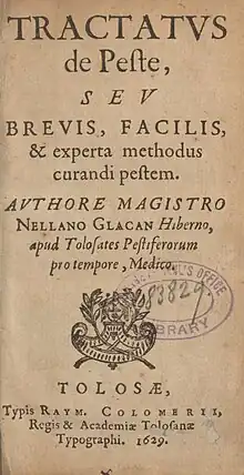 : CS1 maint: location missing publisher (link) - 1 2 3 4 5 Ó Glacáin, Niall (1629). Tractatus de Peste. Toulouse, France: University of Toulouse Press. p. 130.