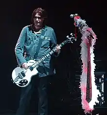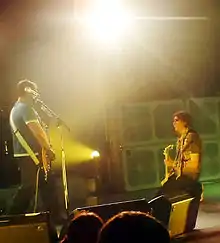 Wire is a founding member of Manic Street Preachers and was originally rhythm guitarist but changed to playing the bass guitar after original bassist Flicker left the band.[4] He co-wrote the band's lyrics with Richey Edwards between 1989 and 1995, taking over sole responsibility following Edwards's disappearance.[5] Some of Edwards' lyrics were used on 1996's Everything Must Go album, making 1998's This Is My Truth Tell Me Yours the first album with lyrics by Wire alone. Wire remains the primary songwriter of Manic Street Preachers although lead singer James Dean Bradfield has written a handful of songs, and the 2009 album Journal for Plague Lovers contained lyrics by Edwards, posthumously used by the rest of the band. Wire usually plays Gibson Thunderbird, Rickenbacker, Fender Jazz and most recently Italia Maranello basses, one of which is a custom acoustic model made by request for the band's 2007 acoustic sessions.