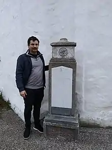 ![]() Sandstone grave monument for Niels and Karen Lassen, approx. 1810, by the choir at Sædder church. Descendant Kevin B. Højgaard-Christiansen stands next to it. | |