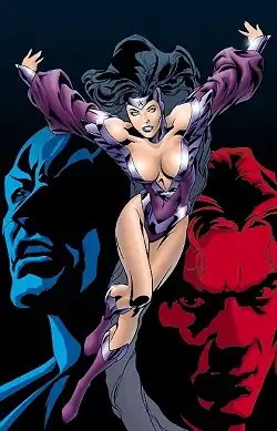 She is next seen in conversation with Avia, daughter of Mister Miracle and Big Barda in an underground bar.[2] Superman appears and makes a powerful recruitment speech for the Justice League. Nightstar is impressed but, unlike Avia, she does not fall in with Superman. Instead, she throws in with Batman, who, through Dick Grayson, is her adopted grandfather, as do many other progeny of League members, including the daughters of Speedy, Aqualad and Flash, and the son of Donna Troy.