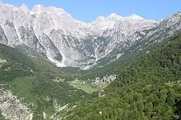Nikaj-Mërtur is a valley trespassed by two rivers: Lumi i Nikajve (English: "Nikaj River") and Lumi i Mërturit (English: "Mërturi River"). The Nikaj River starts in Ndërmanjë valley as Lumi i Zi (English: "Black river"), passes through the Kapiti, Gjonpepaj, and Lekbibaj villages and joins the Mërtur River south-west of Curraj i Poshtëm village. The Mërturi River itself starts in Curraj i Epërm, passes along Mali i Theposur (English: "Sharp mountain") between the villages Shëngjergj and Curraj i Poshtëm, and, after joining the Nikaj River, continues through the villages of Rajë and Tetaj, with the Drin River being its final destination.[2] Both rivers are relatively short.