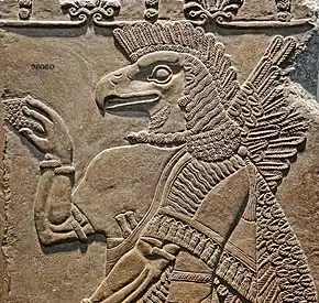 It has been suggested that Ninurta was the inspiration for the figure of Nimrod, a "mighty hunter" who is mentioned in association with Kalhu in the Book of Genesis, although the view has been disputed.[3] He may also be mentioned in the Second Book of Kings under the name Nisroch.[lower-alpha 1] In the nineteenth century, Assyrian stone reliefs of winged, eagle-headed figures from the temple of Ninurta at Kalhu were commonly, but erroneously, identified as "Nisrochs" and they appear in works of fantasy literature from the time period.