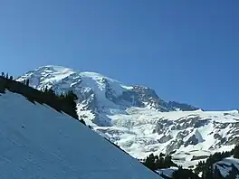 The Nisqually Glacier is one of the larger glaciers on the southwestern face of Mount Rainier in the U.S. state of Washington. The glacier is one of the most easily viewed on the mountain, and is accessible from the Paradise visitor facilities in Mount Rainier National Park. The glacier has had periods of advance and retreat since 1850 when it was much more extensive. It is currently retreating.[1] Measurements made at 9,200 feet (2,800 m) altitude show that glacier got 56 ft (17 m) thicker between 1994 and 1997, suggesting that it will probably begin advancing in the first decade of the 21st century.[2] Nisqually Glacier is the source of the Nisqually River.[1]