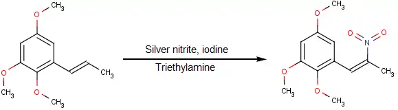 - Nitration of an alkene with nitryl iodide generated in-situ from silver nitrite and elemental iodine:[5]