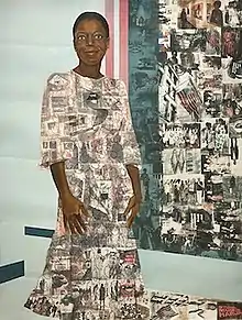She uses photos she has taken herself in Nigeria along with family photos and pages from popular Nigerian magazines.[21] The photos "are layers in her work by collage and acetone-transfer prints, creating a fabric of images throughout her paintings".[22] Her primary mediums include collage, photo transfer, acrylic paint, charcoal, fabric, and colored pencil. Along with strong Nigerian influence, her style is also derived from pop culture, personal experience, and Western academia.[23] While creating, she thinks of her dual audience: American and Nigerian.[10] However, her work cannot be categorized as either American nor Nigerian, but rather the work is an autobiography based on her "character that doesn't fit into a box."[22]