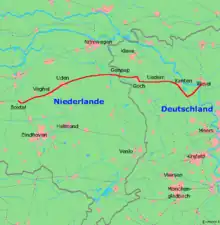 The Noord-Brabantsch-Deutsche Spoorweg-Maatschappij (NBDS) was a railway company undertaking and providing rail transport between Boxtel and Wesel via Uden, Veghel, Gennep, Goch and Xanten. This railway was known in the Netherlands as "Duits lijntje " (German line).[1] On July 15, 1873, the section from Boxtel to Goch could be opened. On July 1, 1878, the second section of the line, the section from Goch to Wesel, could be opened. The total length of the line was 92.7 kilometers, of which 52.7 kilometers on Dutch territory. From Büderich, another 8.2 kilometers of the Köln-Mindener Eisenbahn was used, so was a part of the line from Venlo via Wesel to Haltern, Münster and Hamburg.