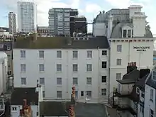An inn and hotel called the Norfolk Arms was built west of Bedford Square in or before 1824—the year it was first listed in the Baxter's Directory of Brighton.[5][6] (The square itself, the second such development in Brighton, was built in stages between 1801 and 1818.)[1] Between 1828 and 1830, the inn became famous for its association with Edward Law, 1st Earl of Ellenborough and his wife Jane Digby, Lady Ellenborough; in 1830 there was a scandal when they divorced as a result of Lady Ellenborough's affair with Prince Felix of Schwarzenberg. Brighton!! A Comic Sketch, a poem written in that year, referred to the building satirically: "But ladies, use, when you next come / The Schwarzenberg Hotel". By 1841, though, its reputation was restored: a guidebook described it as "a capital family hotel, which has long enjoyed the patronage of many persons of rank and distinction".[5] Architecturally, it had Classical overtones: Ionic columns supported a balcony and veranda across a four-storey central bay with three-storey flanking sections.[7]