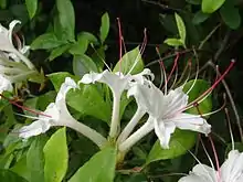 Rhododendron viscosum is also known as the swamp azalea, catch-fly azalea (due to sticky and glandular hairs), and clammy azalea.[1] Its large land area includes growth on the coastal area of Mississippi, and along the east coast from Florida to Maine. In addition to the coastal areas, the swamp azalea can be found inland in higher elevations. It can also be found in Oklahoma, Texas, and Louisiana. As swamp azalea implies, it prefers damp areas. Leaf shape and color vary greatly; from a bland grey-green, to a blue green, and from small and narrow and small to round and large. The texture of the leaf can be smooth, or rough. It is sometimes confused with R. aborescens, but can be distinguished upon comparison of leaf textures. The stem of R. aborescens is smooth, and R. viscosum has a hairy stem that is slimmer. The flowers are usually white and fragrant. This azalea is in bloom from May to September.[1]