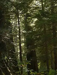 The North American inland temperate rainforest is a 7 million hectare disjunct temperate rainforest spreading over parts of British Columbia in Canada as well as Washington, Idaho and Montana on the US side.[1] Its patches are located on the windward slopes of the Rocky Mountains and the Columbia Mountains, extending roughly over 1000km from 54° North to 45° North.[2] It is one of the largest inland temperate rainforests in the world.[3]