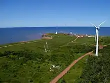 The North Cape Wind Farm is a small 16-turbine wind farm located at North Cape in the community of Seacow Pond, immediately south of the WEICan facility. The wind farm was developed in two 8-turbine phases with phase one being completed in November 2001 and phase two being completed in November 2003. The wind turbines being used are the Vestas V-47-660 model with a rated generating capacity of 660 kWh (2,400 MJ).[12] At 100% production, the 16 turbines are capable of generating 10.5600 MWh (38,016 MJ) of electrical power per year.[13]