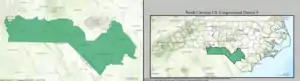 North Carolina's 9th congressional district is a congressional district in south-central North Carolina. The district's current boundaries were redrawn in February 2016 after a U.S. District Court overturned the existing boundaries because of politically directed gerrymandering that suppressed minority representation.[3][4] The new congressional district consists of Union, Chatham, Anson, Richmond, Scotland, and Robeson counties; a southeast portion of Mecklenburg County; and parts of Cumberland, Moore and Bladen counties.