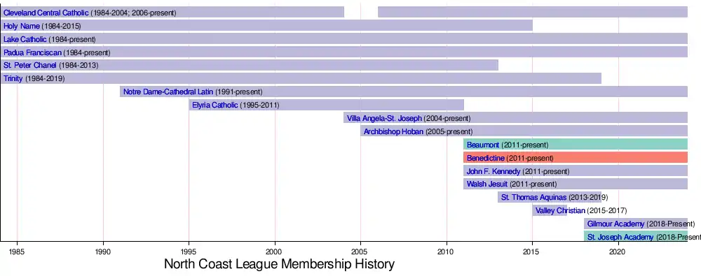 The North Coast League (NCL) was a high school athletic conference for Catholic schools in Greater Cleveland, Ohio. The NCL was founded in 1984 by six parochial high schools: Cleveland Central Catholic, Holy Name, Lake Catholic, Pacua Franciscan, St. Peter Chanel, and Trinity. The league expanded throughout the 1990s and 2000s, reaching a peak of 13 members in the early-to-mid 2010s, before declining in membership. The NCL disbanded after the 2019-20 school year.[1]