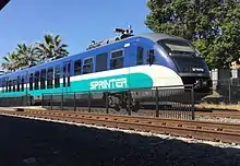 The SPRINTER's first day of service was March 9, 2008.[4] The annual ridership was 2.5 million people in 2015,[4] with an average weekday ridership of 8,300 people.[4] Fifteen stations are served by the Sprinter route.[4] SPRINTER equipment includes 12 Siemens Desiro diesel multiple unit passenger trains.[4] NCTD also owns a maintenance facility and rail yard for their Sprinter service in Escondido, between Escondido Transit Center and Nordahl Road station.