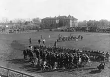 The Bison fielded their first team in 1894 and were originally known as the NDAC Farmers.[8] From the early 1900s to 1921, the nickname of the school then known as North Dakota Agricultural College was the Aggies. The first coach for the new NDAC football team was Henry Bolley, who also fielded the first football program at Purdue University in 1887 and was their first Quarterback. He challenged the University of North Dakota to a football match in 1890, but did not have enough players until 1894, the first official year of football at NDSU. In 1902, Eddie Cochems, known as the father of the forward pass was hired as head coach of the Bison where he experimented building an offense around his new technique; which subsequently became legal in the 1906 college football season; Cochems went 9–1 in his two-year stint as head coach. The college hired famed Michigan halfback Paul Magoffin, the first player to ever catch a forward pass in 1907, as head coach, but he left for the head coaching position offered to him by George Washington University a year later. The 1918 season was canceled due to the outbreak of the Spanish Flu in conjunction with the first World War. The 1943 and 1944 seasons were also canceled due to World War II and the shortage of eligible players. Keeping with their Michigan favoritism, the NDAC hired Stanley Borleske in 1919 to coach the football, basketball, and baseball teams. After six years of on and off coaching. and a 36–36–7 record, Borleske left for Fresno State but is largely credited with developing the Bison mascot. It was well known he was not a fan of the "Aggies" mascot, wanting something 'strong and fierce' he came up with the 'Bison' which remains the mascot today. He also coined the term "Thundering Herd" which is still a common reference to the NDSU Bison Football fanbase.[8]