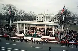 A reviewing stand is erected on the North Lawn facing Pennsylvania Avenue prior to the inauguration of the president. The president uses the enclosed structure to review the parade, which proceeds from the U.S. Capitol.