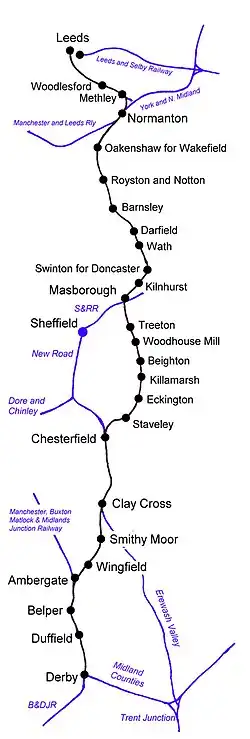 Stephenson decided the line would follow the river valleys from Derby to Leeds, with minimal gradients and large radii curves. It therefore bypassed Sheffield, but met the Sheffield and Rotherham Railway at Masbrough.