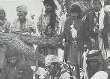 The new republican government was headed by Qadi Abdul Rahman Iryani, Ahmed Noman, and Mohamed Ali Uthman. The Prime Minister was Mohsin al-Aini. Noman, however, remained in Beirut. He was doubtful of his colleagues reluctance to negotiate with the Hamidaddin family, preferring to expel it instead. On November 23, he resigned, and his place was taken by Hassan Amri.[91] Prince Mohamed bin Hussein told the country's chiefs "We have money, and you will have your share if you join us. If not, we will go on without you". The chiefs agreed to mobilize their tribes. 6,000 royalist regulars and 50,000 armed tribesmen known as "the Fighting Rifles" surrounded San'a, captured its main airport and severed the highway to the port of Hodeida, a main route for Russian supplies. In a battle twelve miles east of the capital, 3,200 soldiers of both sides were killed, and an entire republican regiment reportedly deserted to the royalists. Bin Hussein gave them an ultimatum: "Surrender the city or be annihilated".[92] Iryani went to Cairo for what the Egyptian official press agency called "a medical checkup". Foreign Minister Hassan Makki also left Yemen, leaving the government in charge of Amri. Amri declared a 6 p.m. curfew and ordered civilians to form militia units "to defend the republic". In Liberation Square, six suspected royalist infiltrators were publicly executed by a firing squad, and their bodies were later strung up on poles.[92]