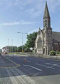 The church is constructed with a front in yellow sandstone, and the sides and rear in brick. The roof is slated.[1] It is described by the authors of the Buildings of England series as "quite a landmark".[2] The church is recorded in the National Heritage List for England as a designated Grade II listed building.[1]
