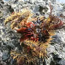 This crustacean has a hard rounded-triangular shell, or carapace, that is covered in hair-like projections that vary in size. The shell's length is 1.3 times the size of its width, the shell's surface has many tubercles with spines running to the front of the shell going to the sides.[2] The edges of the carapace have nine outward directed sharp spines: 3 supraorbital, 3 hepatic and 3 brachial.[2] Two spines at the front of the crab's head form a V-shape and are covered with small bristles. Some of the bristles along the carapace are short and hooked while others are long and straight.[3] The abdomen has seven segments in both sexes with the male abdomen being more narrowwith the segments being broader than longer.[2] The legs are longest in the front and get progressively shorter towards the back. It has three pairs of walking legs, a pair of swimming legs in the back, and a pair of claws at the front called chelipeds. The walking legs are long and slender with the back of the legs covered in a longitudinal row of short hooked bristles including long straight bristles.[4] The pincers are orange or red with white tips, and the legs have brown hairs. As a decorator crab, this crab attaches seaweed or algae from its environment to the hooked hairs on its body, which gives this crab camouflage along the ocean floor.[5] Hairy seaweed crabs change their camouflage with 10-20% of the cover being replaced each day, this causes their movement to be very sluggish like many other spider crabs.[1]