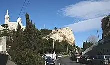 The rocky outcrop upon which the basilica would be built is an Urgonian limestone peak dating from the Barremian and rising to a height of 162 metres.[2] Due to its height and proximity to the coast, the hill became an important stronghold and lookout point, as well as a landmark for sailing. In 1302 Charles II of Anjou ordered one of his ministers to set beacons along the Mediterranean coast of Provence. One of these beacon sites was the hill of Notre-Dame de la Garde.[3]