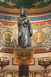 Escaramagne bought at auction an 18th-century statue of the Virgin and child from a monastery of the Picpus Fathers that had been demolished during the Revolution. He offered the statue to the La Garde church. The scepter that the virgin had held was replaced by a bouquet of flowers, hence the statue became known as the "Virgin of the bouquet". To make way for a new silver statue created in 1837, this statue was given to the Montrieux charterhouse, then returned in 1979 to the sanctuary.[29] The statue of the Virgin of the bouquet is currently displayed on the altar in the crypt.