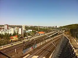 The Nové spojení (Czech for "New Connection",[2] full name Nové spojení Praha hl.n., Masarykovo n. – Libeň, Vysočany, Holešovice[3]) is a series of tunnels and bridges forming an important part of the railway network in Prague, Czech Republic. The network was constructed between 2004 and 2008 and opened in 2010. It links the two central stations, Praha hlavní and Praha Masarykovo, to Libeň, Vysočany and Holešovice stations and the start of their respective mainline corridors towards Česká Třebová, Hradec Králové and Ústí nad Labem.[4] The construction has increased the capacity of the trunk lines serving Praha hlavní nádraží, allowing more trains to terminate there. Prior to its completion, many international trains terminated at Holešovice station, due to lack of access to the centre from the northern and eastern routes. Trains are now also able to travel at speeds of up to 100 kilometres per hour (62 mph) on the tunnel sections.[3] The construction is also part of a larger plan to improve the sections of pan-European corridors on Czech territory.[4]