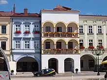 The town square is lined by preserved Renaissance and Baroque burger houses. The town hall was a Renaissance house from the 16th century, rebuilt to the town hall in 1661. In 1881, the façade was rebuilt and modified in the pseudo-Gothic style. In 1929–1930, an insensitive pseudo-Renaissance reconstruction was made.[12]