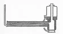 Like George Stephenson, Ericsson understood that a large area was needed to extract heat from the hot gases. This he did in a long horizontal tube filled with water which ran under the full length of the engine. It can be seen in the illustration on top of this page, sticking out to the right, with the vertical chimney attached to it. Within the horizontal section was a tube carrying the hot gases, this formed an ‘S’ shape so the gases made three passes through the water. This S-shaped tube was also tapered causing the gases to speed up as they cooled down. In practice this tube is almost impossible to clean.