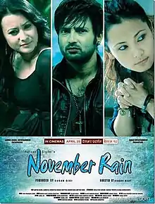 November Rain is a 2014 Nepali-language romantic drama film directed by Dinesh Raut and produced by Aaryan Sigdel and Sunil Giri, and it is written by Chettan Gurung. The movie is about the love story of Aayush (Aaryan Sigdel) and Sheetal (Namrata Shrestha), but the story takes a dramatic turn when it is revealed that the heart of Aayush was illegally transferred by the doctor to Sheetal's son to allow them to survive. Dalli (Chultim Gurung) is in unrequitedly in love with Aayush.[1] It was released in 2014 worldwide with positive reviews from critics, with praise aimed towards performances, direction, and story, but some critics criticised its runtime. Although the film had an average box-office opening, positive word of mouth from audiences helped the movie to register one of the highest collections at the Nepalese box office. The movie eventually became a huge commercial success.[2] The film is now considered one of the best romantic movies ever made in Nepal.