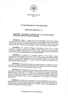 On February 28, 2022, President Rodrigo Duterte approved and signed a executive order to include nuclear power in the country's energy mix, as authorities prepare to phase out of coal-fired power plants and after earlier efforts failed due to safety concerns. The order states that it can combat the power outages and the electricity prices, despite environmental radiation concerns. Duterte said nuclear power would be tapped as a viable alternative baseload power source as the Philippines seeks to retire coal plants to help meet climate goals.[9][10] The weak electrical grid connections between the over 1000 inhabited islands of the Philippine archipelago presents a challenge to a nuclear policy. The mothballed Bataan Nuclear Power Plant is close to Manila, the largest electrical demand location, so is an option for revival or the site of a new plant.[11]