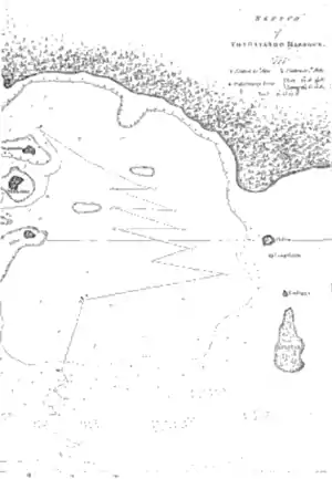 At length, about two in the afternoon, we arrived at our intended station. It was a very snug place, formed by the shore of Tongataboo on the South East, and two small islands on the East and North East. Here we anchored in ten fathoms water, over a bottom of oozy sand; distant from the shore one-third of a mile [500 m].[1]