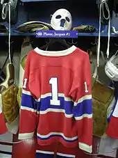 Goaltender Jacques Plante's No. 1 jersey exhibited at the Hockey Hall of Fame. Over time, the number 1 became less common among players in that position.
