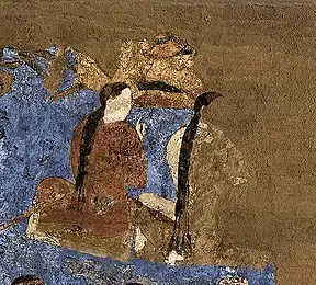 In the Afrasiab paintings, the Nushibi Western Turks are ethnic Turks, rather than Turkicized Sogdians, as suggested by the marked Mongoloid features and faces without beards.[1] They are the most numerous ethnic group in the mural, and are not ambassadors, but rather military attendants.[1] Their depiction offers a unique glimpse into the costumes of the Turks in the 6-7th century CE.[1] They typically wear 3 or 5 long plaits, often gathered together into a single long one.[1] They have ankle-long monochromic sleeved coats with two lapels.[1] This fashion for the collar is first seen in Khotan near Turfan, a traditional Turkic land, in the 2nd-4th century CE.[1] They have low black sharp-nosed boots. They wear gold bracelets with lapis lazuli or pearls.[1]