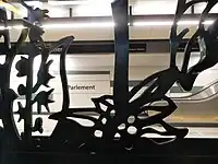 Algonquin Birch Bark Biting Window Art | Simon Brascoupé, Claire Brascoupé, and Mairi Brascoupé | Depictions of Algonquin birch bark biting on the station's windows[3] | |||